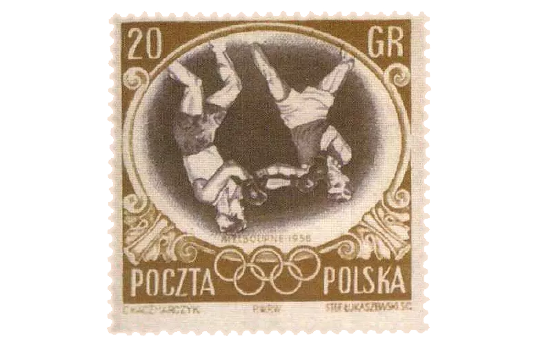 odwrotka bokserów, błędnie wydrukowany (błąd drukarski) 20-groszowy znaczek z serii przygotowanej na Igrzyska Olimpijskie w Melbourne w 1956,